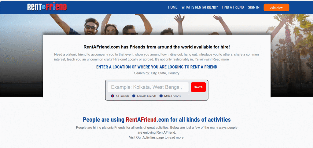 RentAFriend is online and offline friendship-based website. This website works worldwide so, rent a friend from all over the world. Search you friend by city, state and country. This website provides more than 40 services like baking, cooking, business events, going to a park, wine testing, tutoring, and many more.